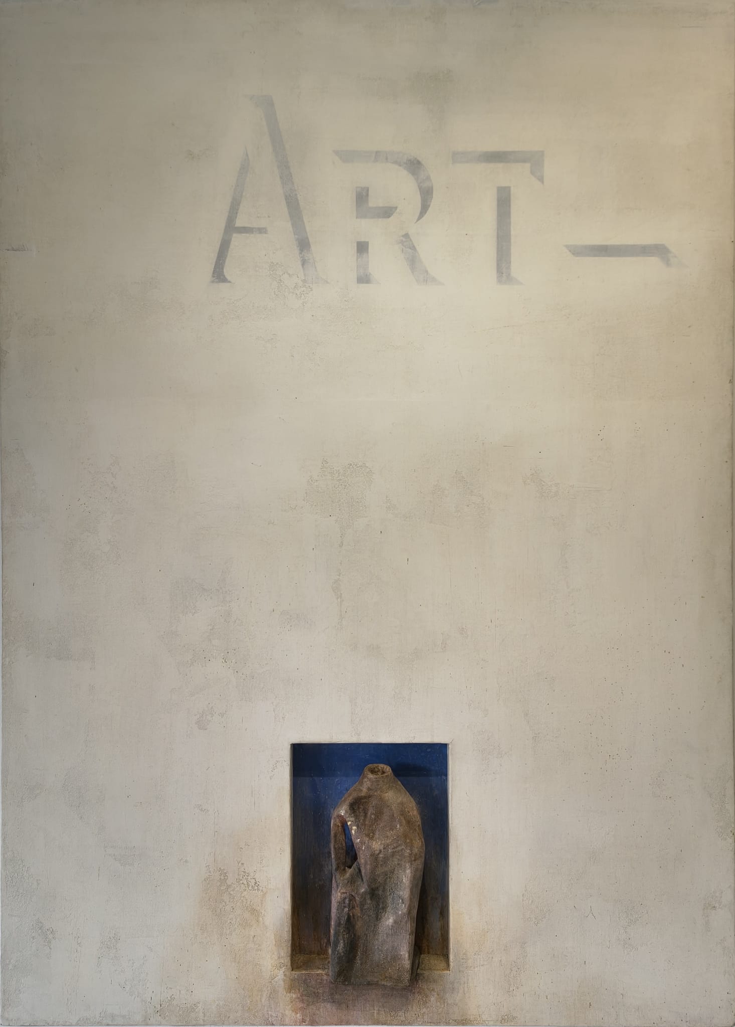 Daydream explores masculinity, desire, and vulnerability through layered imagery, found objects, and subtle text. In contrast, Summer in Essex celebrates domestic joy and creative freedom. Dominated by luminous whites, these works mark a dramatic shift from Remaut’s earlier grays and blacks, During this period, he also experimented with English milk bottles, transforming everyday objects into art. Mounted on canvas or arranged in crates, the bottles assert a playful, Duchampian presence while retaining Remaut’s tactile sensibility.